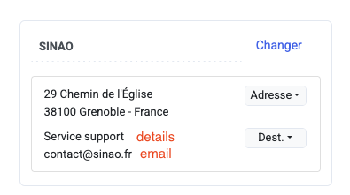 // Pas besoin de l'ID, new créera un nouveau client pour vous. "contact_infos": { "new": true, "name": "SINAO", "billing_name": "SINAO", "type": "organization", "location": "38100 Grenoble - France", "address": "29 Chemin de l'Église" },